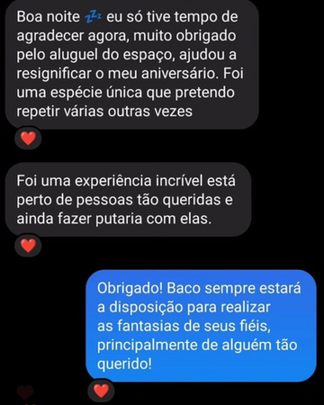 El Clube do Baco es un grupo creado para promover fiestas liberales para todo tipo de hombres. Aquí buscamos fortalecer lazos de respeto y amistad, además de permitir que nuestros miembros cumplan sus fantasías más íntimas. Todo con seguridad, discreción e higiene.
